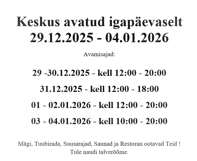 Keskus avatud igapäevaselt 29.12.2025 – 04.01.2026