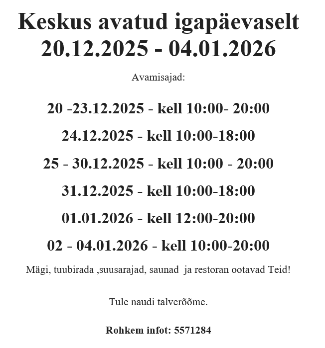 Vaata, millised põnevad üritused meid ees ootavad! Tulemas on sportlikud väljakutsed, perepäevad ja hooajalised sündmused, mis pakuvad elamusi igas vanuses külastajatele. Tutvu kavaga ja leia oma lemmik!